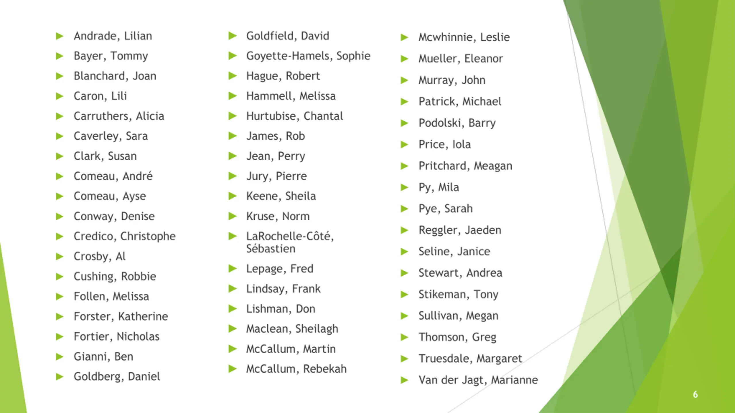 ► Goldfield, David ► Andrade, Lilian ► Mcwhinnie, Leslie ► Goyette-Hamels, Sophie ► Bayer, Tommy ► Mueller, Eleanor ► Hague, Robert ► Blanchard, Joan ► Murray, John ► Hammell, Melissa ► Caron, Lili ► Patrick, Michael ► Hurtubise, Chantal ► Carruthers, Alicia ► Podolski, Barry ► James, Rob ► Caverley, Sara ► Price, Iola ► Jean, Perry ► Clark, Susan ► Pritchard, Meagan ► Jury, Pierre ► Comeau, André ► Py, Mila ► Keene, Sheila ► Comeau, Ayse ► Pye, Sarah ► Kruse, Norm ► Conway, Denise ► Reggler, Jaeden ► LaRochelle-Côté, Sébastien ► Credico, Christophe ► Seline, Janice ► Crosby, Al ► Lepage, Fred ► Stewart, Andrea ► Cushing, Robbie ► Lindsay, Frank ► Stikeman, Tony ► Follen, Melissa ► Lishman, Don ► Sullivan, Megan ► Forster, Katherine ► Maclean, Sheilagh ► Fortier, Nicholas ► Thomson, Greg ► McCallum, Martin ► Gianni, Ben ► Truesdale, Margaret ► McCallum, Rebekah ► Goldberg, Daniel ► Van der Jagt, Marianne 6 6