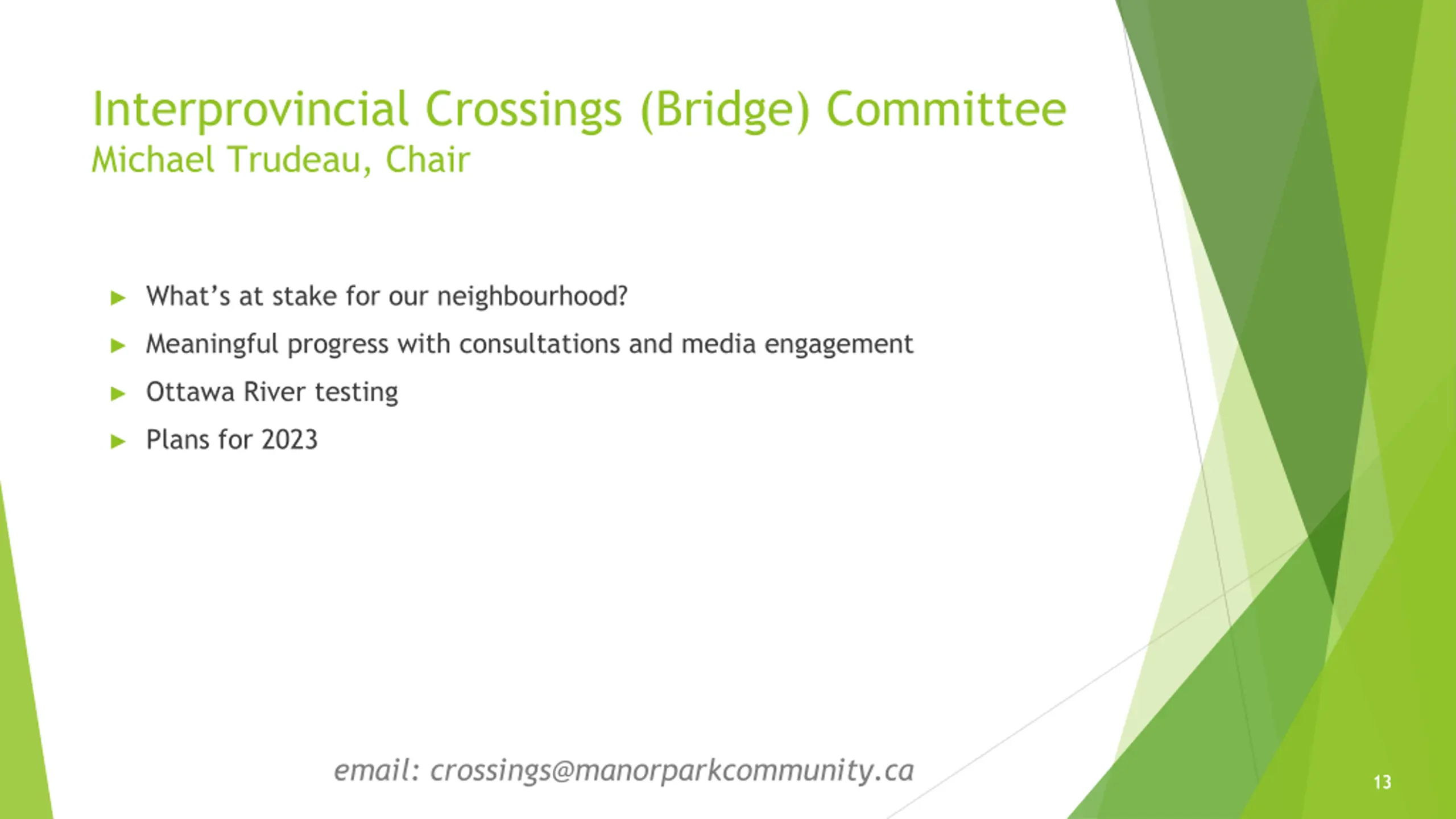Interprovincial Crossings (Bridge) Committee Michael Trudeau, Chair ► What’s at stake for our neighbourhood? ► Meaningful progress with consultations and media engagement ► Ottawa River testing ► Plans for 2023 email: crossings@manorparkcommunity.ca 13 13
