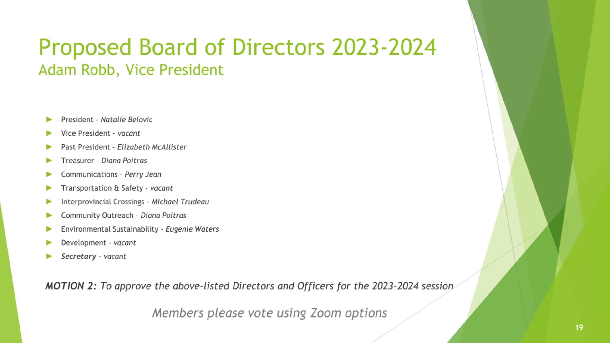Proposed Board of Directors 2023-2024 Adam Robb, Vice President ► President - Natalie Belovic ► Vice President - vacant ► Past President - Elizabeth McAllister ► Treasurer – Diana Poitras ► Communications – Perry Jean ► Transportation & Safety - vacant ► Interprovincial Crossings - Michael Trudeau ► Community Outreach – Diana Poitras ► Environmental Sustainability - Eugenie Waters ► Development – vacant ► Secretary - vacant MOTION 2: To approve the above-listed Directors and Officers for the 2023-2024 session Members please vote using Zoom options 19 19