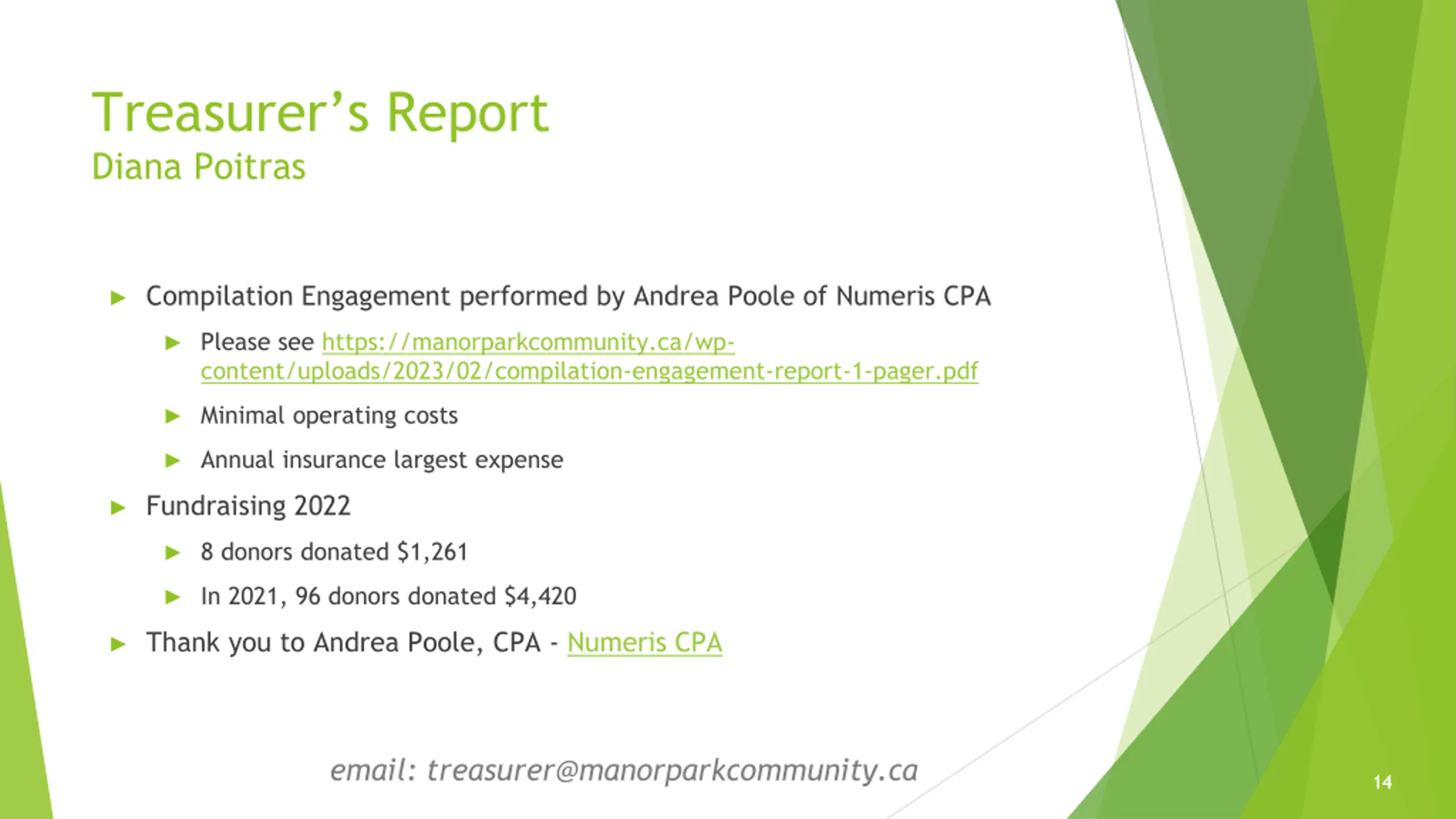 Treasurer’s Report Diana Poitras ► Compilation Engagement performed by Andrea Poole of Numeris CPA ► Please see https://manorparkcommunity.ca/wp- content/uploads/2023/02/compilation-engagement-report-1-pager.pdf ► Minimal operating costs ► Annual insurance largest expense ► Fundraising 2022 ► 8 donors donated $1,261 ► In 2021, 96 donors donated $4,420 ► Thank you to Andrea Poole, CPA - Numeris CPA email: treasurer@manorparkcommunity.ca 14 14