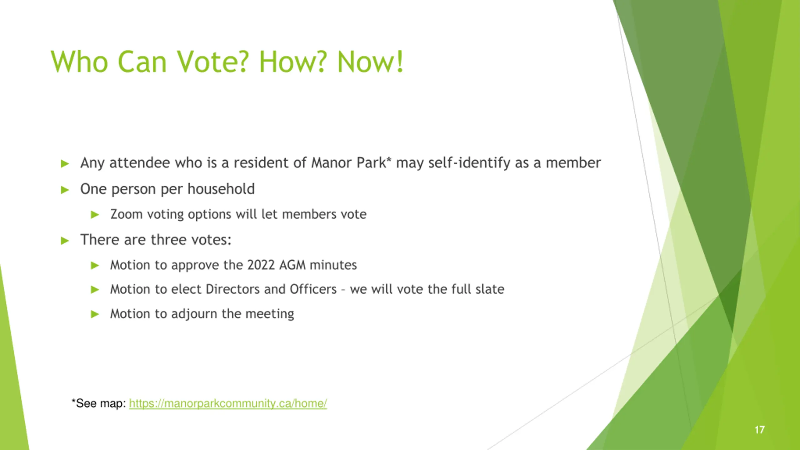 Our Business Tonight Adam Robb, Vice President ► Approve the minutes of the 2022 AGM ► Voting for the incoming Board ► Receiving the Compilation Engagement(financial report) email: vp@manorparkcommunity.ca 16 16