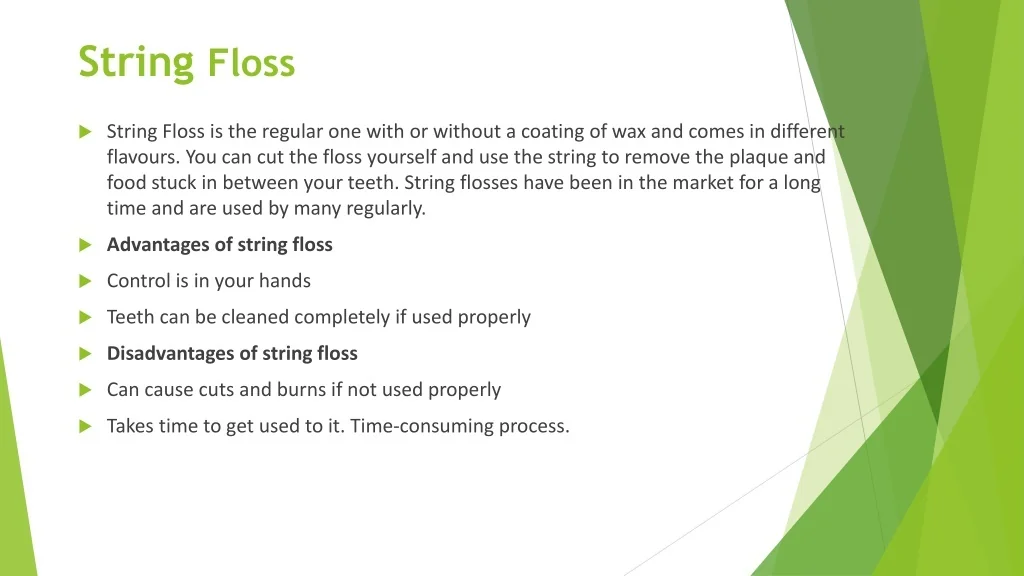 String Floss • String Floss is the regular one with or without a coating of wax and comes in different flavours. You can cut the floss yourself and use the string to remove the plaque and food stuck in between your teeth. String flosses have been in the market for a long time and are used by many regularly. • Advantages of string floss • Control is in your hands • Teeth can be cleaned completely if used properly • Disadvantages of string floss • Can cause cuts and burns if not used properly • Takes time to get used to it. Time-consuming process.