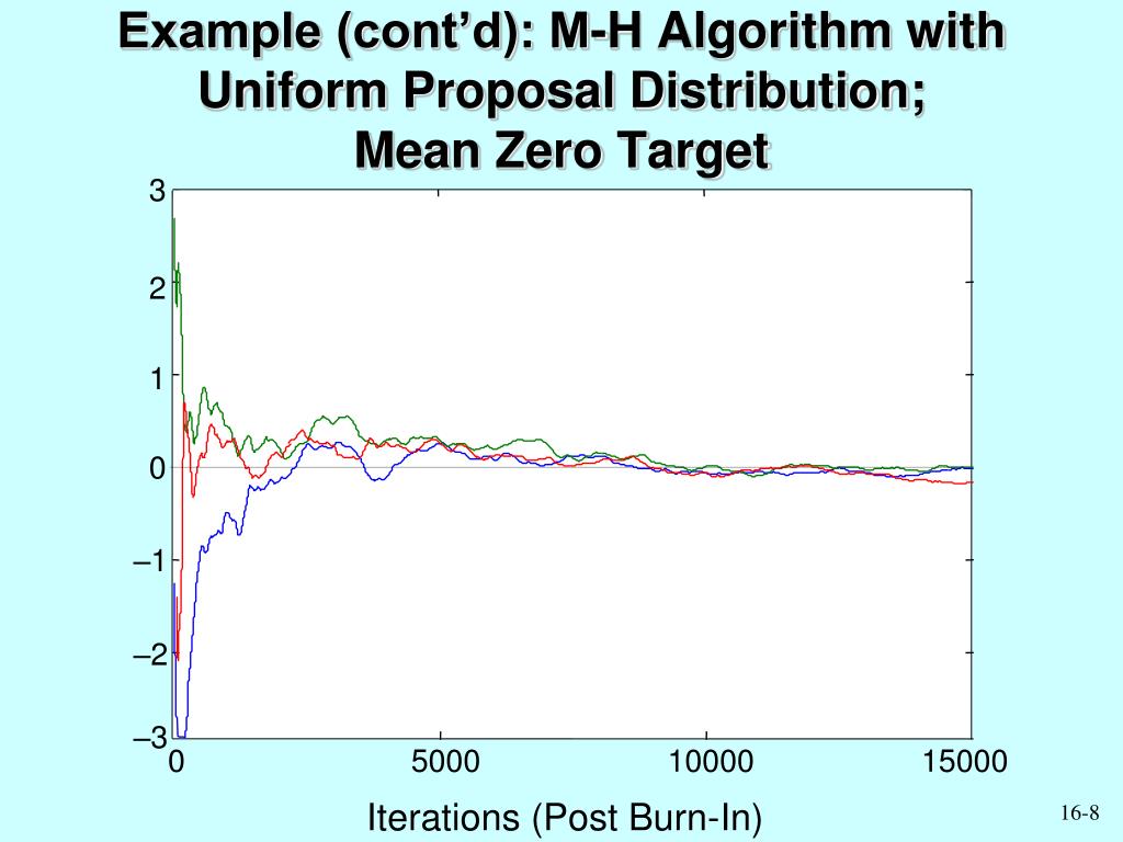 Example (cont’d): M-H Algorithm with Uniform Proposal Distribution; Mean Zero Target 3 2 1 0 –1 –2 –3 0 5000 10000 15000 Iterations (Post Burn-In)