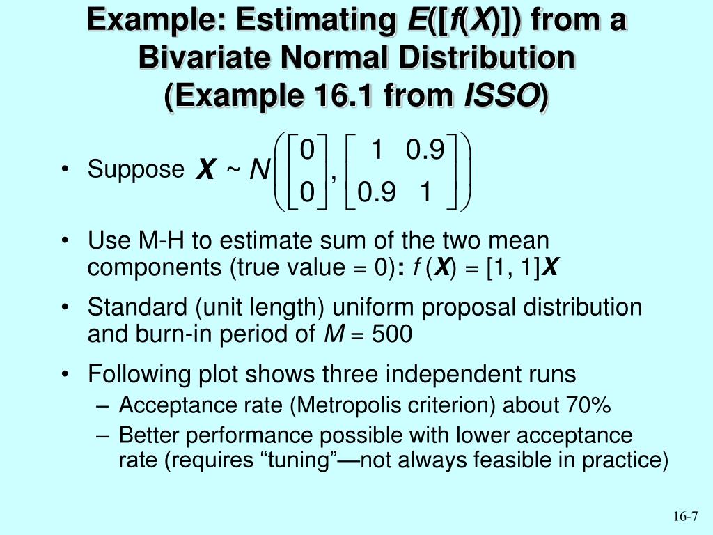 Example: Estimating E([f(X)]) from a Bivariate Normal Distribution(Example 16.1 from ISSO) • Suppose • Use M-H to estimate sum of the two mean components (true value = 0):f(X) = [1,1]X • Standard (unit length) uniform proposal distribution and burn-in period of M = 500 • Following plot shows three independent runs • Acceptance rate (Metropolis criterion) about 70% • Better performance possible with lower acceptance rate (requires “tuning”—not always feasible in practice)