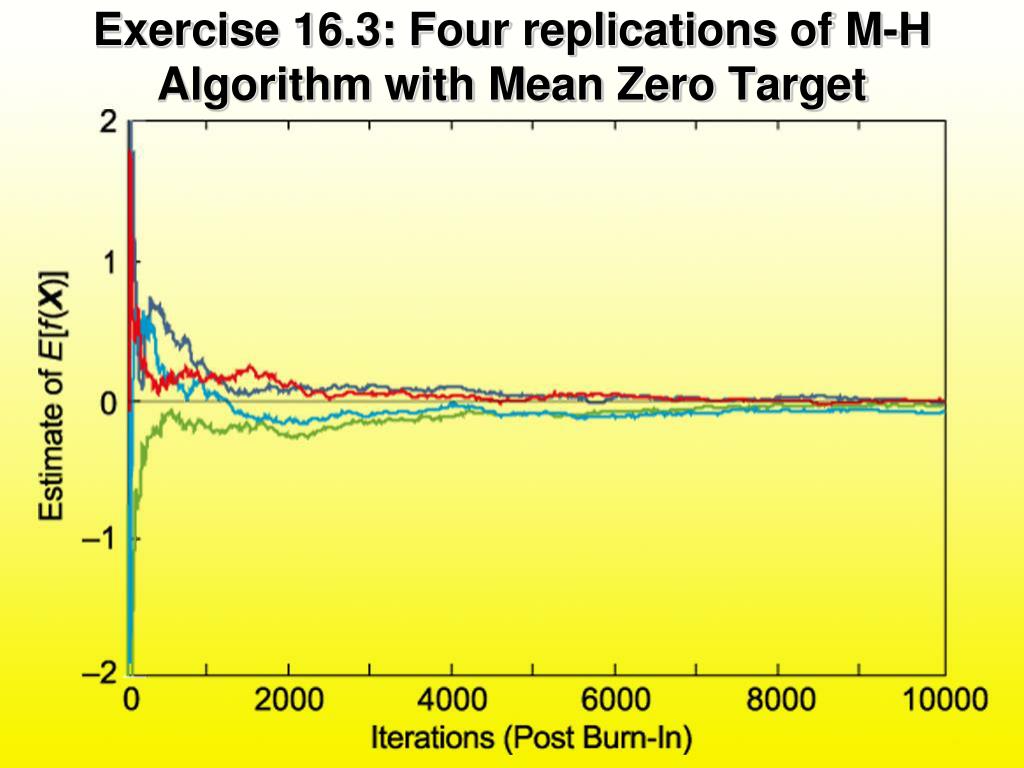 Exercise 16.3: Four replications of M-H Algorithm with Mean Zero Target