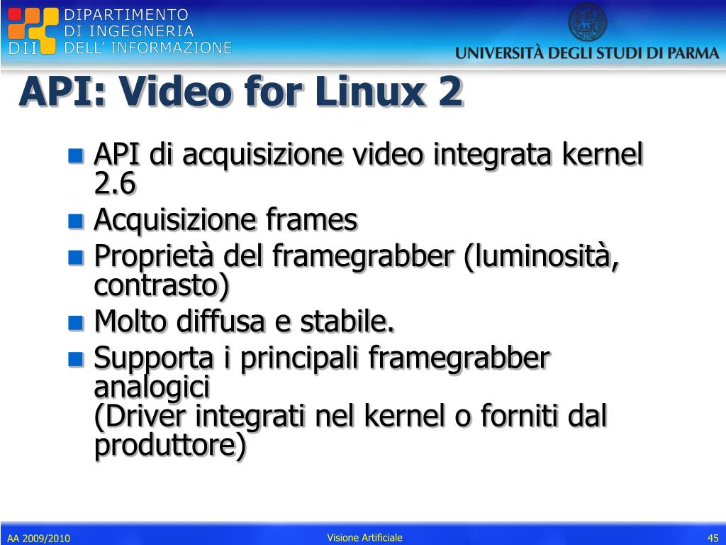 API: Video for Linux 2 • API di acquisizione video integrata kernel 2.6 • Acquisizione frames • Proprietà del framegrabber (luminosità, contrasto) • Molto diffusa e stabile. • Supporta i principaliframegrabberanalogici(Driver integratinel kernel o forniti dal produttore) Visione Artificiale