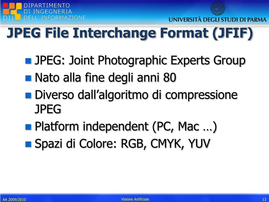 JPEG File Interchange Format (JFIF) • JPEG: Joint PhotographicExperts Group • Nato alla fine degli anni 80 • Diverso dall’algoritmo di compressione JPEG • Platform independent (PC, Mac …) • Spazi di Colore: RGB, CMYK, YUV Visione Artificiale
