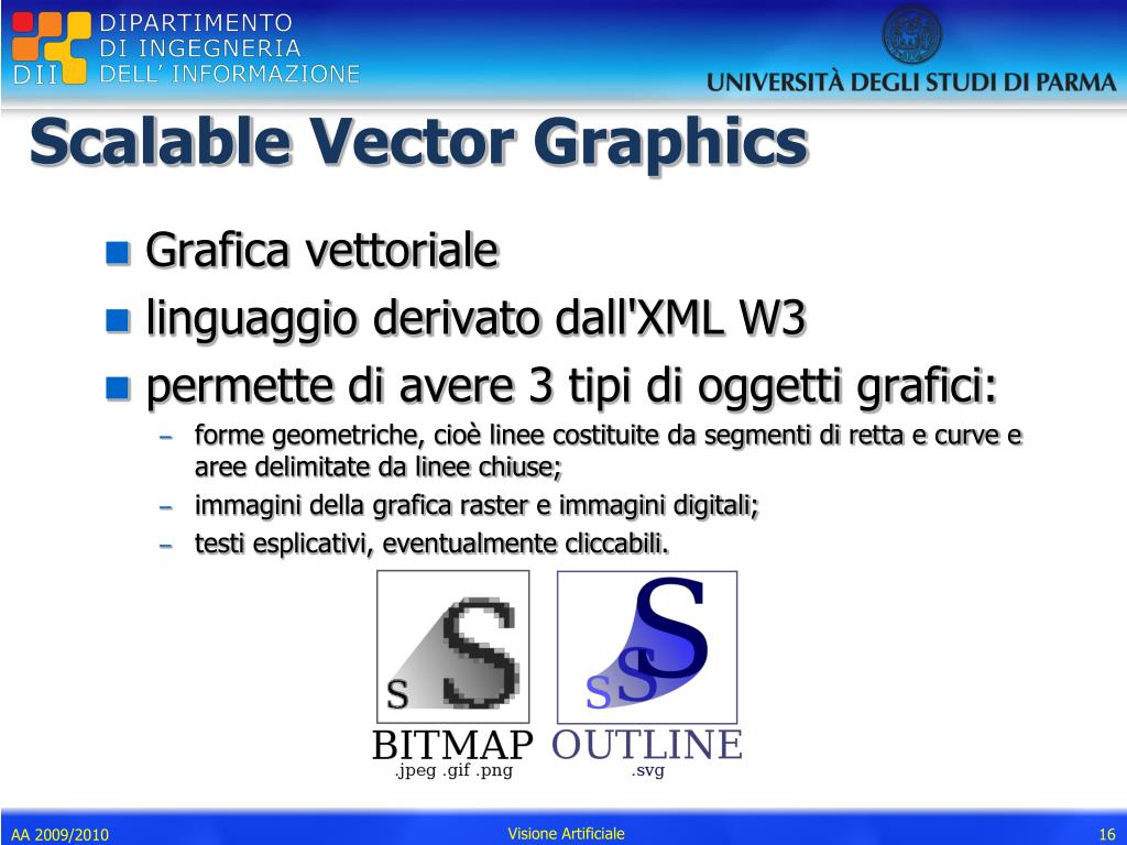 Scalable Vector Graphics • Grafica vettoriale • linguaggio derivato dall'XML W3 • permette di avere 3tipi di oggetti grafici: • forme geometriche, cioè linee costituite da segmenti di retta e curve e aree delimitate da linee chiuse; • immagini della grafica raster e immagini digitali; • testi esplicativi, eventualmente cliccabili. Visione Artificiale