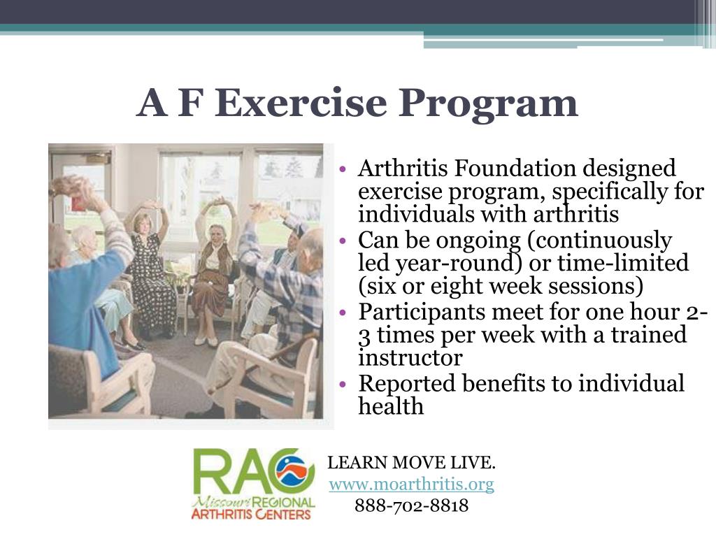 A F Exercise Program • Arthritis Foundation designed exercise program, specifically for individuals with arthritis • Can be ongoing (continuously led year-round) or time-limited (six or eight week sessions) • Participants meet for one hour 2-3 times per week with a trained instructor • Reported benefits to individual health LEARN MOVE LIVE. www.moarthritis.org 888-702-8818
