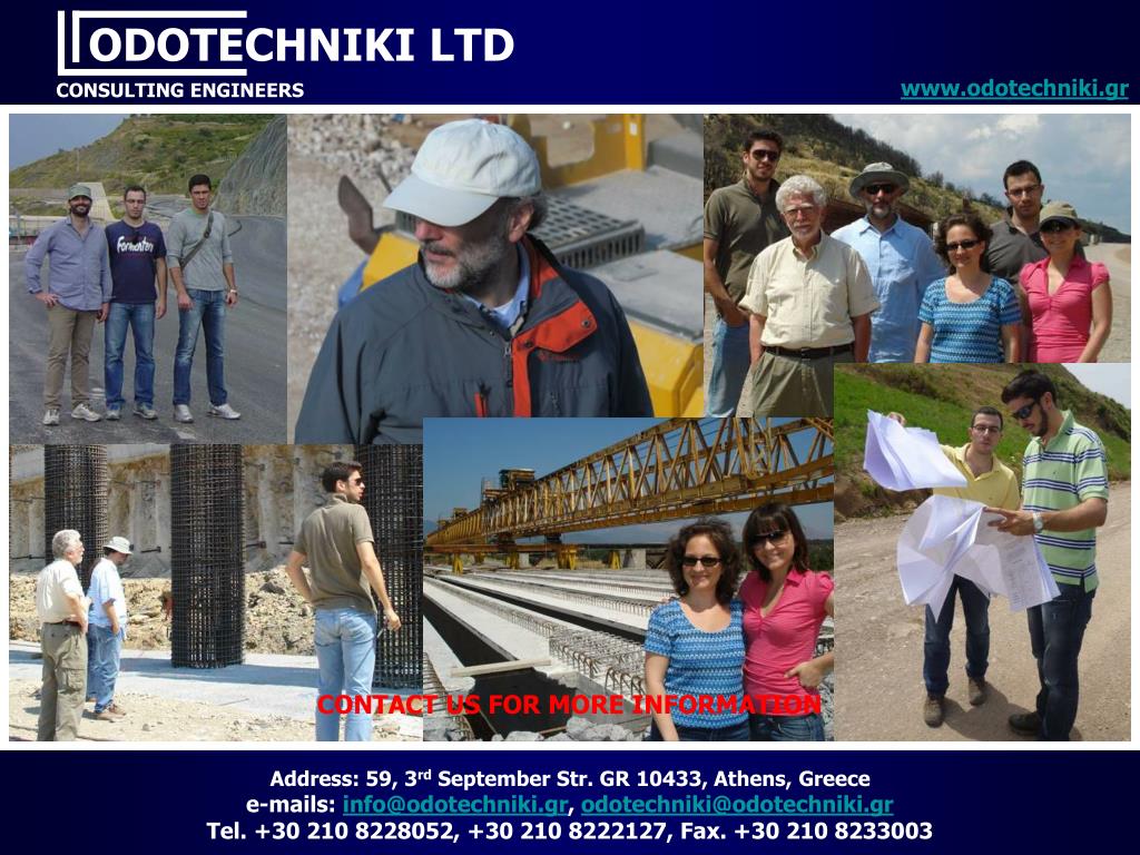 ODOTECHNIKI LTD www.odotechniki.gr CONSULTING ENGINEERS CONTACT US FOR MORE INFORMATION Address: 59, 3rd September Str. GR 10433, Athens, Greece e-mails: info@odotechniki.gr, odotechniki@odotechniki.gr Tel. +30 210 8228052, +30 210 8222127, Fax. +30 210 8233003