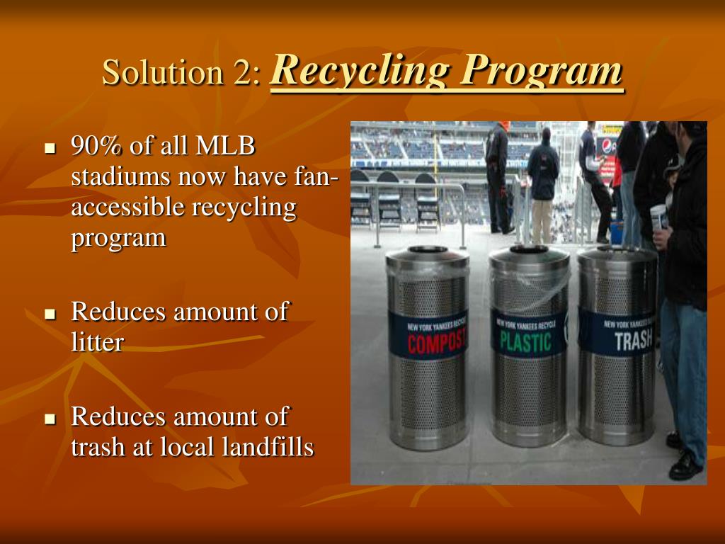 Solution 2: Recycling Program • 90% of all MLB stadiums now have fan-accessible recycling program • Reduces amount of litter • Reduces amount of trash at local landfills