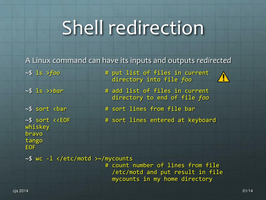 Shell redirection A Linux command can have its inputs and outputs redirected ~$ ls >foo # put list of files in current directory into file foo ~$ ls>>bar # add list of files in current directory to end of file foo ~$ sort <bar # sort lines from file bar ~$ sort <<EOF # sort lines entered at keyboardwhiskeybravotangoEOF ~$ wc -l </etc/motd >~/mycounts # count number of lines from file /etc/motd and put result in filemycounts in my home directory cja 2014
