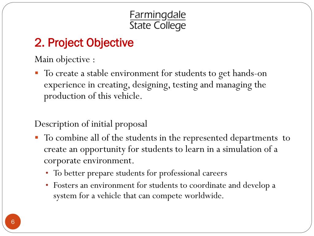 2. Project Objective Main objective : • To create a stable environment for students to get hands-on experience in creating, designing, testing and managing the production of this vehicle. Description of initial proposal • To combine all of the students in the represented departments to create an opportunity for students to learn in a simulation of a corporate environment. • To better prepare students for professional careers • Fosters an environment for students to coordinate and develop a system for a vehicle that can compete worldwide.