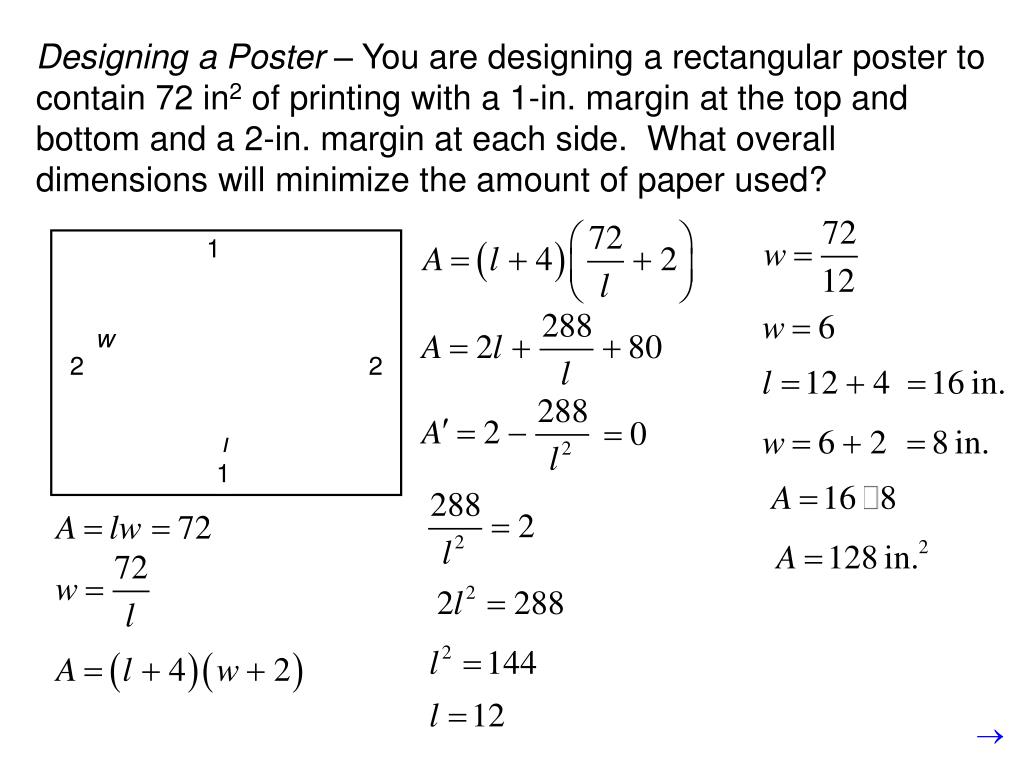 Designing a Poster – You are designing a rectangular poster to contain 72 in2 of printing with a 1-in. margin at the top and bottom and a 2-in. margin at each side. What overall dimensions will minimize the amount of paper used? 1 w 2 2 l 1
