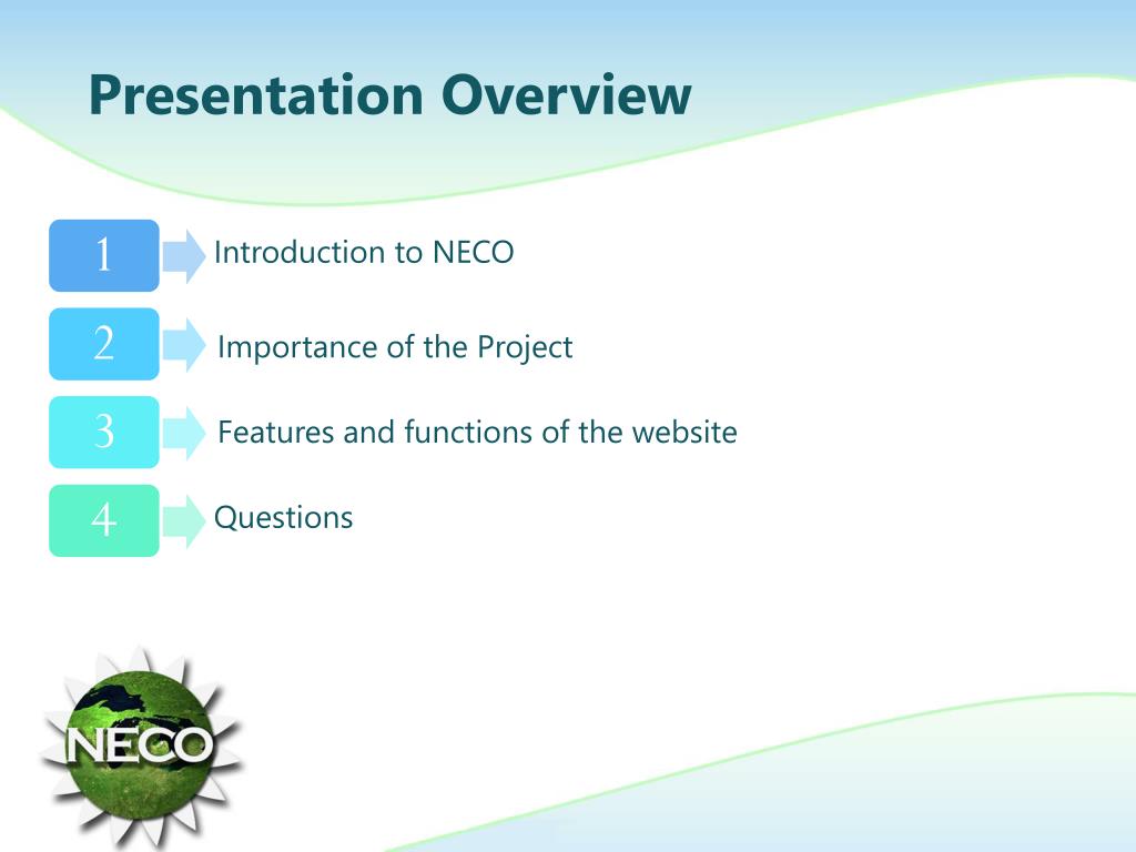 Presentation Overview Introduction to NECO 1 3 4 2 Importance of the Project Features and functions of the website Questions