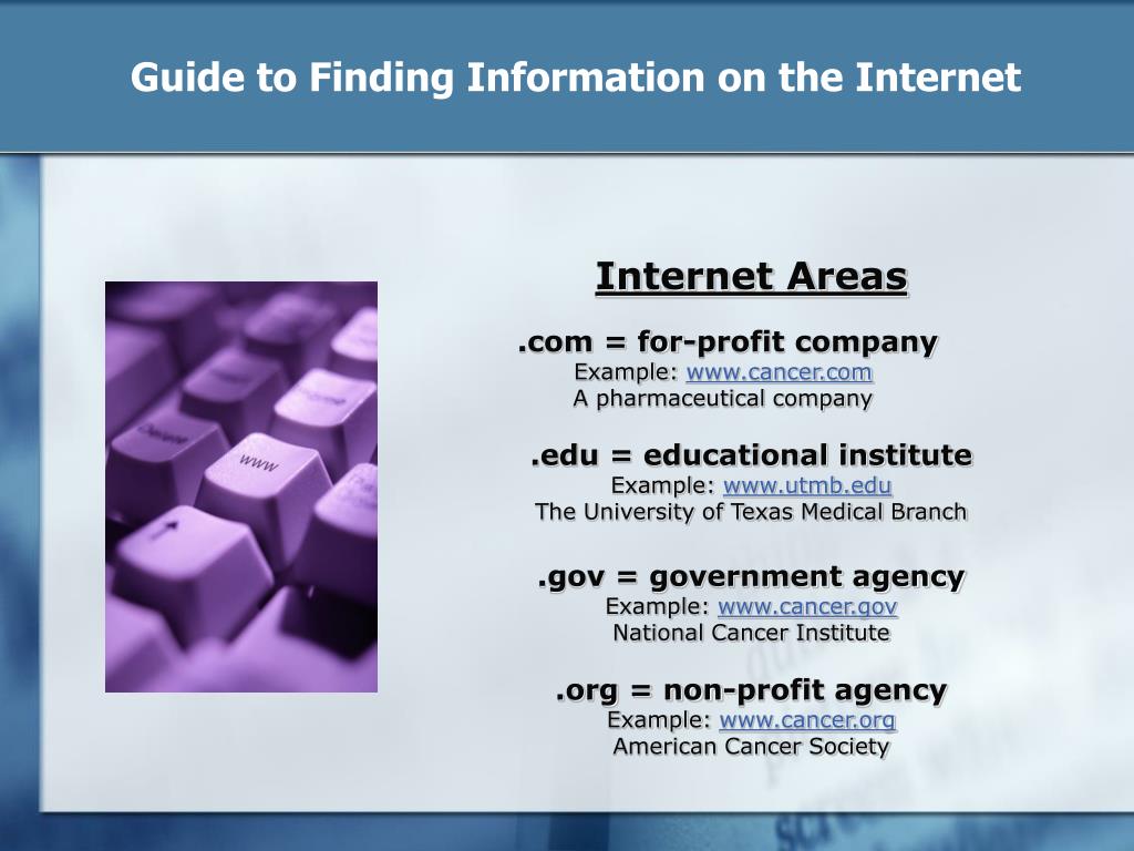 Guide to Finding Information on the Internet • Internet Areas • .com = for-profit company • Example: www.cancer.com • A pharmaceutical company • .edu = educational institute • Example: www.utmb.edu • The University of Texas Medical Branch • .gov = government agency • Example: www.cancer.gov • National Cancer Institute • .org = non-profit agency • Example: www.cancer.org • American Cancer Society