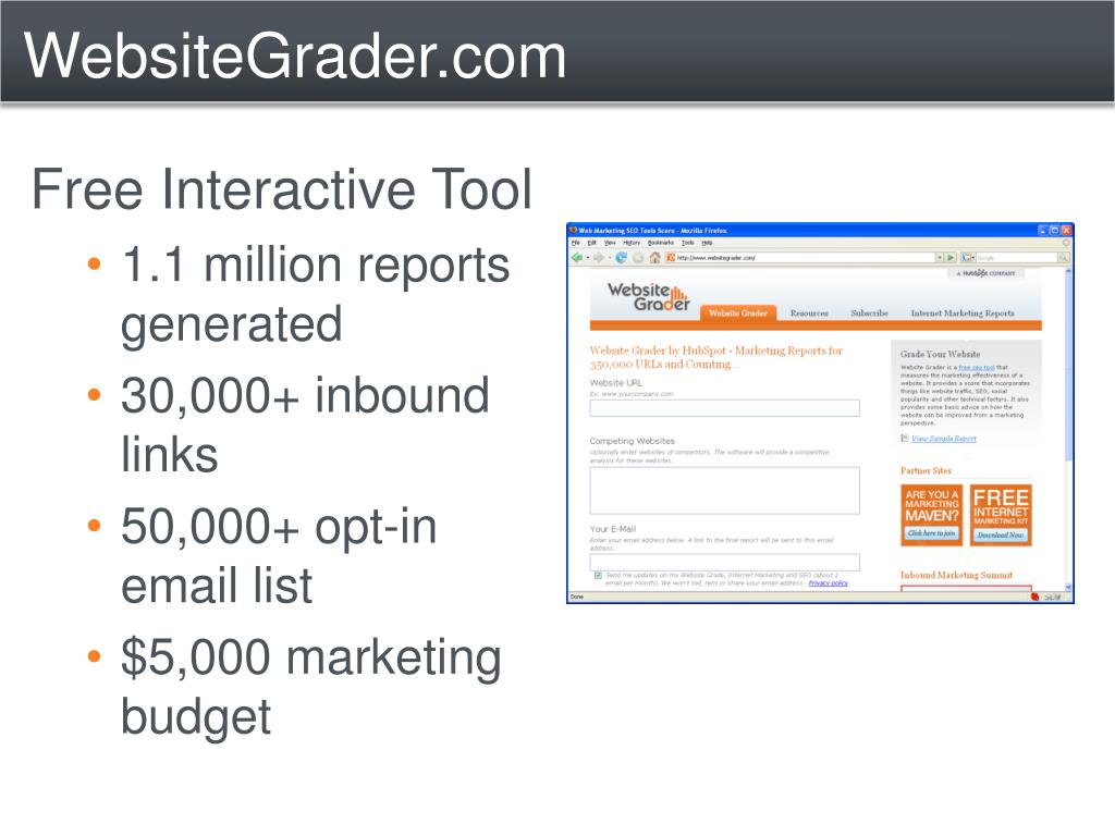 WebsiteGrader.com Free Interactive Tool • 1.1 million reports generated • 30,000+ inbound links • 50,000+ opt-in email list • $5,000 marketing budget