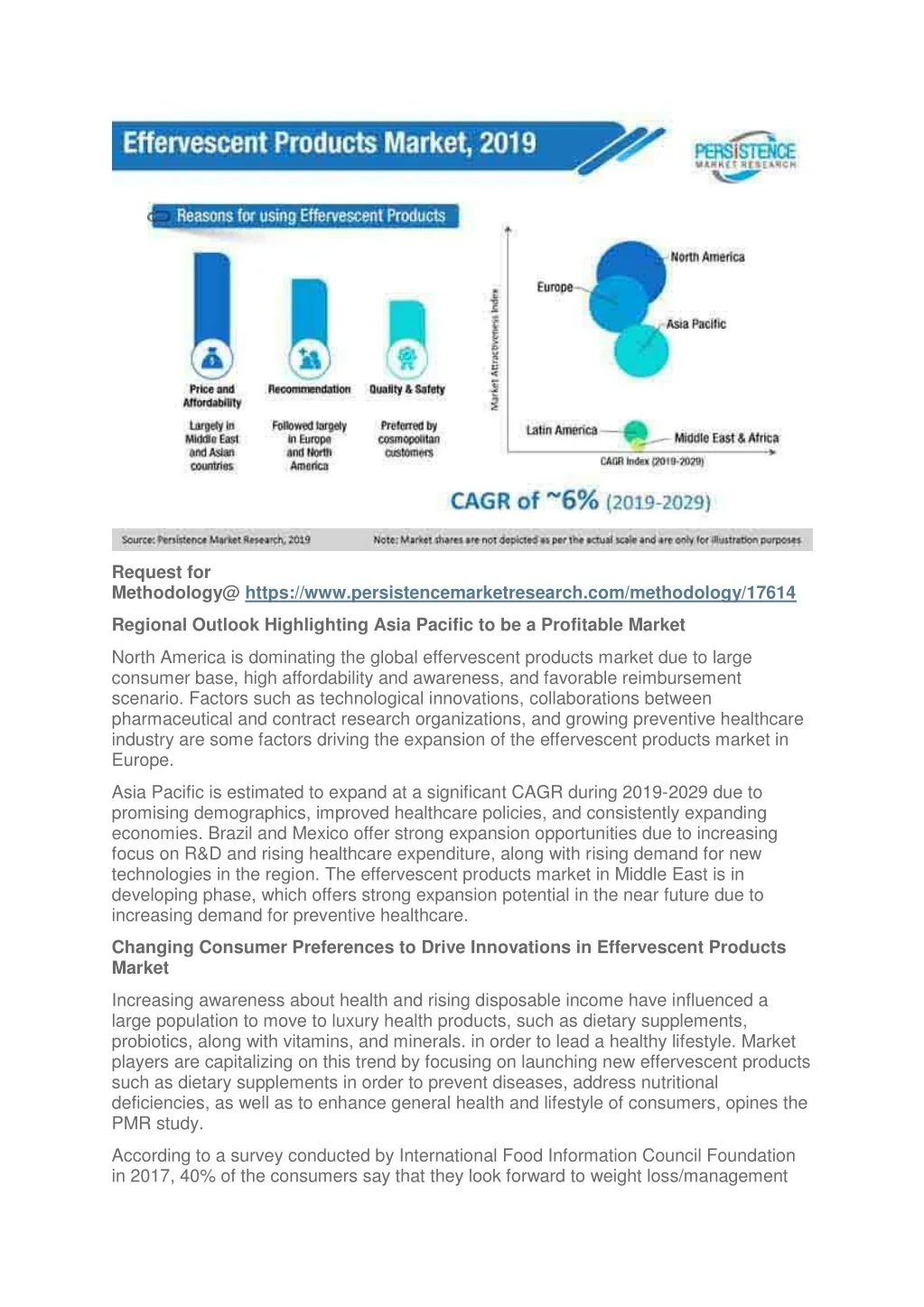 Request for Methodology@ https://www.persistencemarketresearch.com/methodology/17614 Regional Outlook Highlighting Asia Pacific to be a Profitable Market North America is dominating the global effervescent products market due to large consumer base, high affordability and awareness, and favorable reimbursement scenario. Factors such as technological innovations, collaborations between pharmaceutical and contract research organizations, and growing preventive healthcare industry are some factors driving the expansion of the effervescent products market in Europe. Asia Pacific is estimated to expand at a significant CAGR during 2019-2029 due to promising demographics, improved healthcare policies, and consistently expanding economies. Brazil and Mexico offer strong expansion opportunities due to increasing focus on R&D and rising healthcare expenditure, along with rising demand for new technologies in the region. The effervescent products market in Middle East is in developing phase, which offers strong expansion potential in the near future due to increasing demand for preventive healthcare. Changing Consumer Preferences to Drive Innovations in Effervescent Products Market Increasing awareness about health and rising disposable income have influenced a large population to move to luxury health products, such as dietary supplements, probiotics, along with vitamins, and minerals. in order to lead a healthy lifestyle. Market players are capitalizing on this trend by focusing on launching new effervescent products such as dietary supplements in order to prevent diseases, address nutritional deficiencies, as well as to enhance general health and lifestyle of consumers, opines the PMR study. According to a survey conducted by International Food Information Council Foundation in 2017, 40% of the consumers say that they look forward to weight loss/management