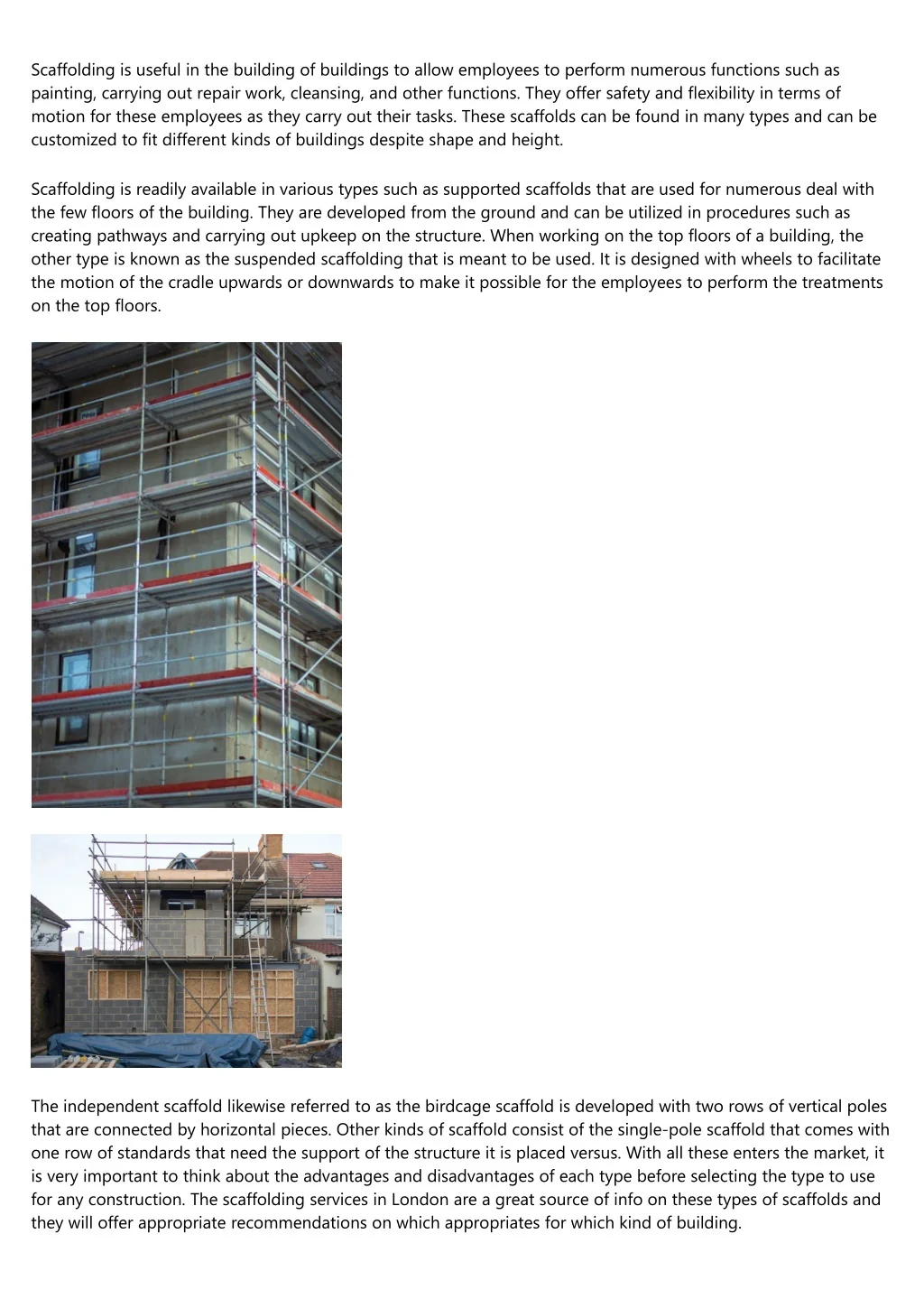 Scaffolding is useful in the building of buildings to allow employees to perform numerous functions such as painting, carrying out repair work, cleansing, and other functions. They offer safety and flexibility in terms of motion for these employees as they carry out their tasks. These scaffolds can be found in many types and can be customized to fit different kinds of buildings despite shape and height. Scaffolding is readily available in various types such as supported scaffolds that are used for numerous deal with the few floors of the building. They are developed from the ground and can be utilized in procedures such as creating pathways and carrying out upkeep on the structure. When working on the top floors of a building, the other type is known as the suspended scaffolding that is meant to be used. It is designed with wheels to facilitate the motion of the cradle upwards or downwards to make it possible for the employees to perform the treatments on the top floors. The independent scaffold likewise referred to as the birdcage scaffold is developed with two rows of vertical poles that are connected by horizontal pieces. Other kinds of scaffold consist of the single-pole scaffold that comes with one row of standards that need the support of the structure it is placed versus. With all these enters the market, it is very important to think about the advantages and disadvantages of each type before selecting the type to use for any construction. The scaffolding services in London are a great source of info on these types of scaffolds and they will offer appropriate recommendations on which appropriates for which kind of building.