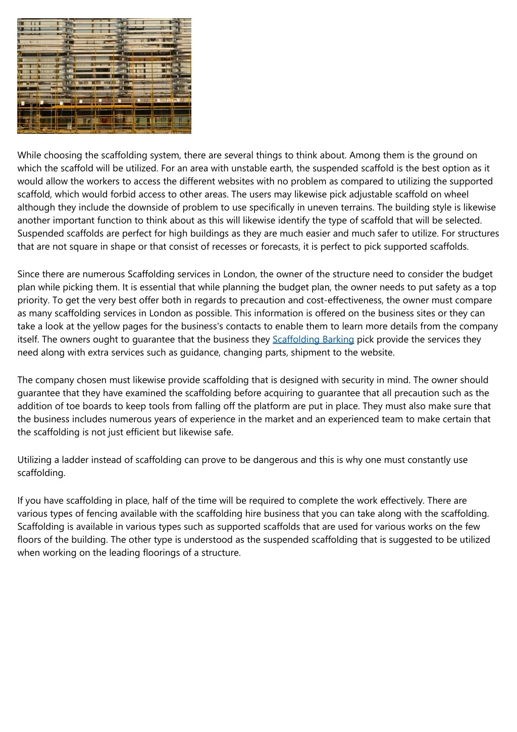 While choosing the scaffolding system, there are several things to think about. Among them is the ground on which the scaffold will be utilized. For an area with unstable earth, the suspended scaffold is the best option as it would allow the workers to access the different websites with no problem as compared to utilizing the supported scaffold, which would forbid access to other areas. The users may likewise pick adjustable scaffold on wheel although they include the downside of problem to use specifically in uneven terrains. The building style is likewise another important function to think about as this will likewise identify the type of scaffold that will be selected. Suspended scaffolds are perfect for high buildings as they are much easier and much safer to utilize. For structures that are not square in shape or that consist of recesses or forecasts, it is perfect to pick supported scaffolds. Since there are numerous Scaffolding services in London, the owner of the structure need to consider the budget plan while picking them. It is essential that while planning the budget plan, the owner needs to put safety as a top priority. To get the very best offer both in regards to precaution and cost-effectiveness, the owner must compare as many scaffolding services in London as possible. This information is offered on the business sites or they can take a look at the yellow pages for the business's contacts to enable them to learn more details from the company itself. The owners ought to guarantee that the business they Scaffolding Barking pick provide the services they need along with extra services such as guidance, changing parts, shipment to the website. The company chosen must likewise provide scaffolding that is designed with security in mind. The owner should guarantee that they have examined the scaffolding before acquiring to guarantee that all precaution such as the addition of toe boards to keep tools from falling off the platform are put in place. They must also make sure that the business includes numerous years of experience in the market and an experienced team to make certain that the scaffolding is not just efficient but likewise safe. Utilizing a ladder instead of scaffolding can prove to be dangerous and this is why one must constantly use scaffolding. If you have scaffolding in place, half of the time will be required to complete the work effectively. There are various types of fencing available with the scaffolding hire business that you can take along with the scaffolding. Scaffolding is available in various types such as supported scaffolds that are used for various works on the few floors of the building. The other type is understood as the suspended scaffolding that is suggested to be utilized when working on the leading floorings of a structure.