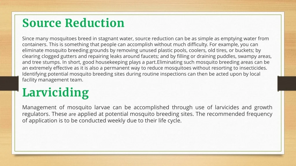 Source Reduction Since many mosquitoes breed in stagnant water, source reduction can be as simple as emptying water from containers. This is something that people can accomplish without much difficulty. For example, you can eliminate mosquito breeding grounds by removing unused plastic pools, coolers, old tires, or buckets; by clearing clogged gutters and repairing leaks around faucets; and by filling or draining puddles, swampy areas, and tree stumps. In short, good housekeeping plays a part.Eliminating such mosquito breeding areas can be an extremely effective as it is also a permanent way to reduce mosquitoes without resorting to insecticides.Identifying potential mosquito breeding sites during routine inspections can then be acted upon by local facility management team. Larviciding Management of mosquito larvae can be accomplished through use of larvicides and growth regulators. These are applied at potential mosquito breeding sites. The recommended frequency of application is to be conducted weekly due to their life cycle.