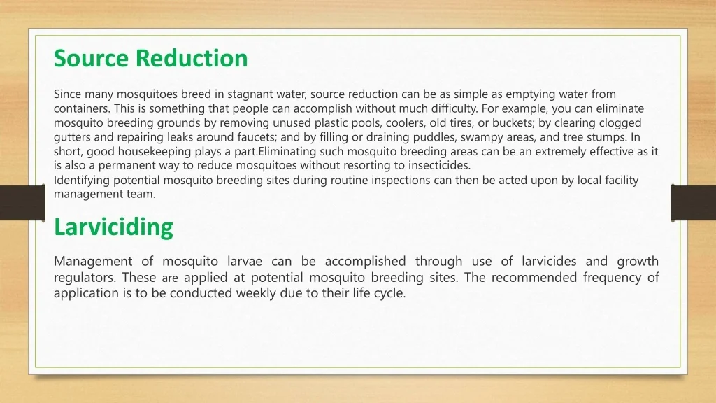 Source Reduction Since many mosquitoes breed in stagnant water, source reduction can be as simple as emptying water from containers. This is something that people can accomplish without much difficulty. For example, you can eliminate mosquito breeding grounds by removing unused plastic pools, coolers, old tires, or buckets; by clearing clogged gutters and repairing leaks around faucets; and by filling or draining puddles, swampy areas, and tree stumps. In short, good housekeeping plays a part.Eliminating such mosquito breeding areas can be an extremely effective as it is also a permanent way to reduce mosquitoes without resorting to insecticides. Identifying potential mosquito breeding sites during routine inspections can then be acted upon by local facility management team. Larviciding Management of mosquito larvae can be accomplished through use of larvicides and growth regulators. These are applied at potential mosquito breeding sites. The recommended frequency of application is to be conducted weekly due to their life cycle.