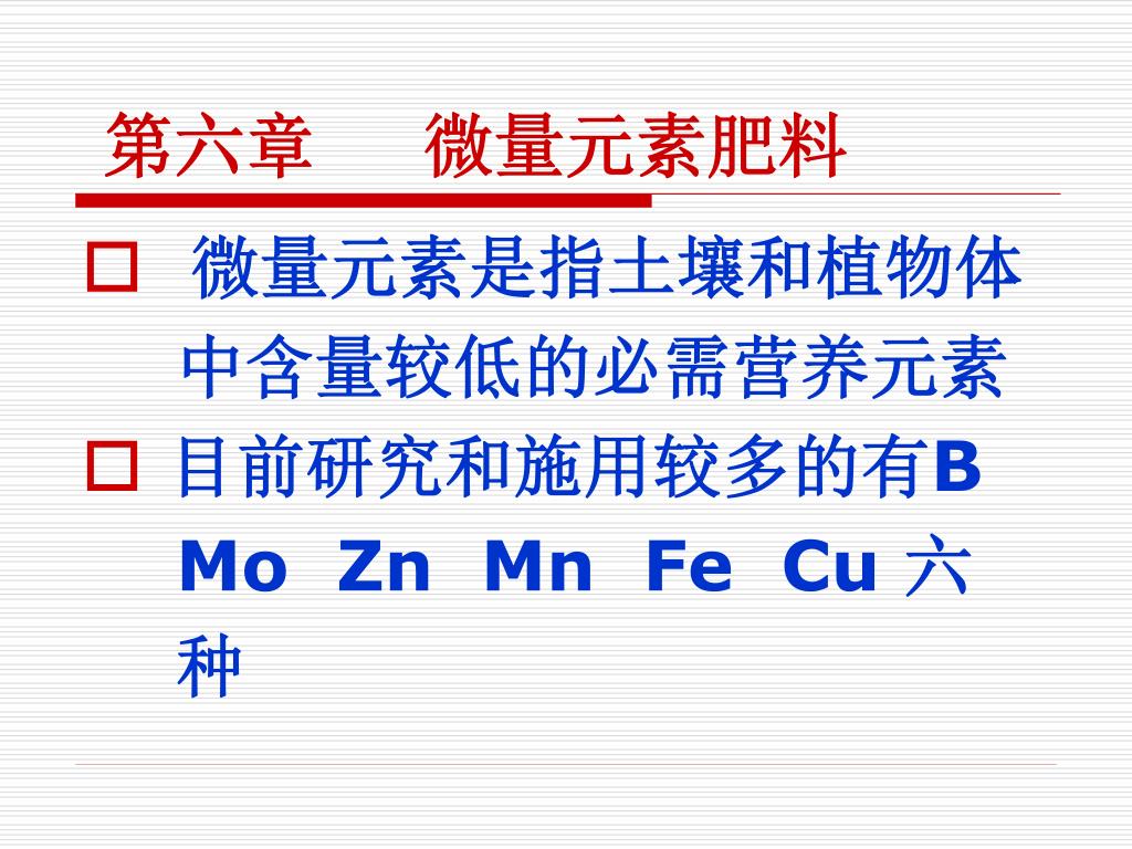 第六章 微量元素肥料 • 第一节 硼肥 • 第二节 锰肥 • 第三节 锌肥 • 第四节 铜肥 • 第五节 钼肥 • 第六节 铁肥