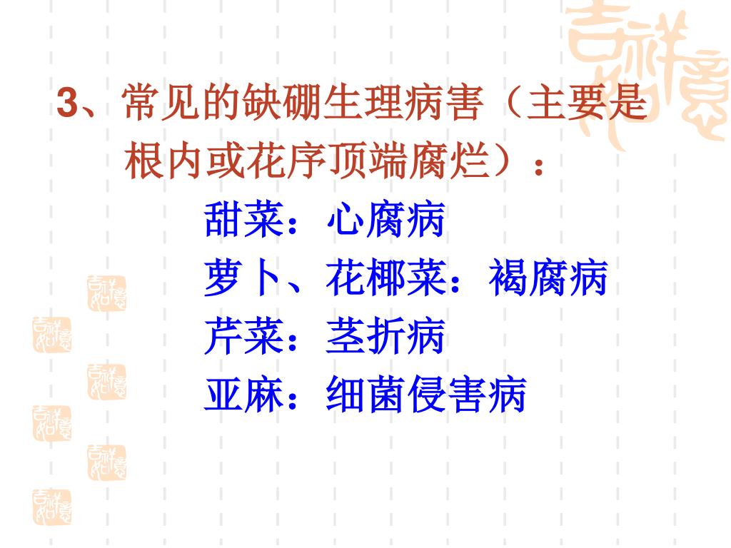 3、常见的缺硼生理病害(主要是 根内或花序顶端腐烂): 甜菜:心腐病 萝卜、花椰菜:褐腐病 芹菜:茎折病 亚麻:细菌侵害病