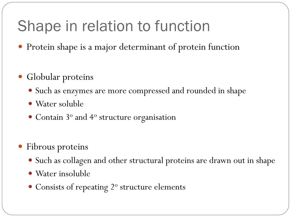 Shape in relation to function • Protein shape is a major determinant of protein function • Globular proteins • Such as enzymes are more compressed and rounded in shape • Water soluble • Contain 3o and 4o structure organisation • Fibrous proteins • Such as collagen and other structural proteins are drawn out in shape • Water insoluble • Consists of repeating 2o structure elements