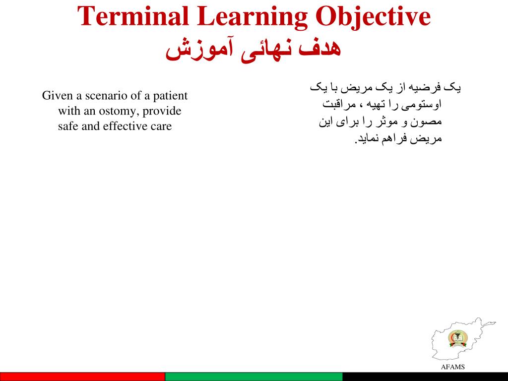 Care of the Ostomy Patient مراقبت مریض اوستومی Learning Objective: Nursing students will gain an understanding of care for the ostomy patient. هدف آموزش : شاگردان نرسنگ مراقب مریض اوستومی را خواهند دانست. Estimated Time to Complete:150 minutes. وقت معین شده برای تکمیل این لکچر: 150دقیقه AFAMS