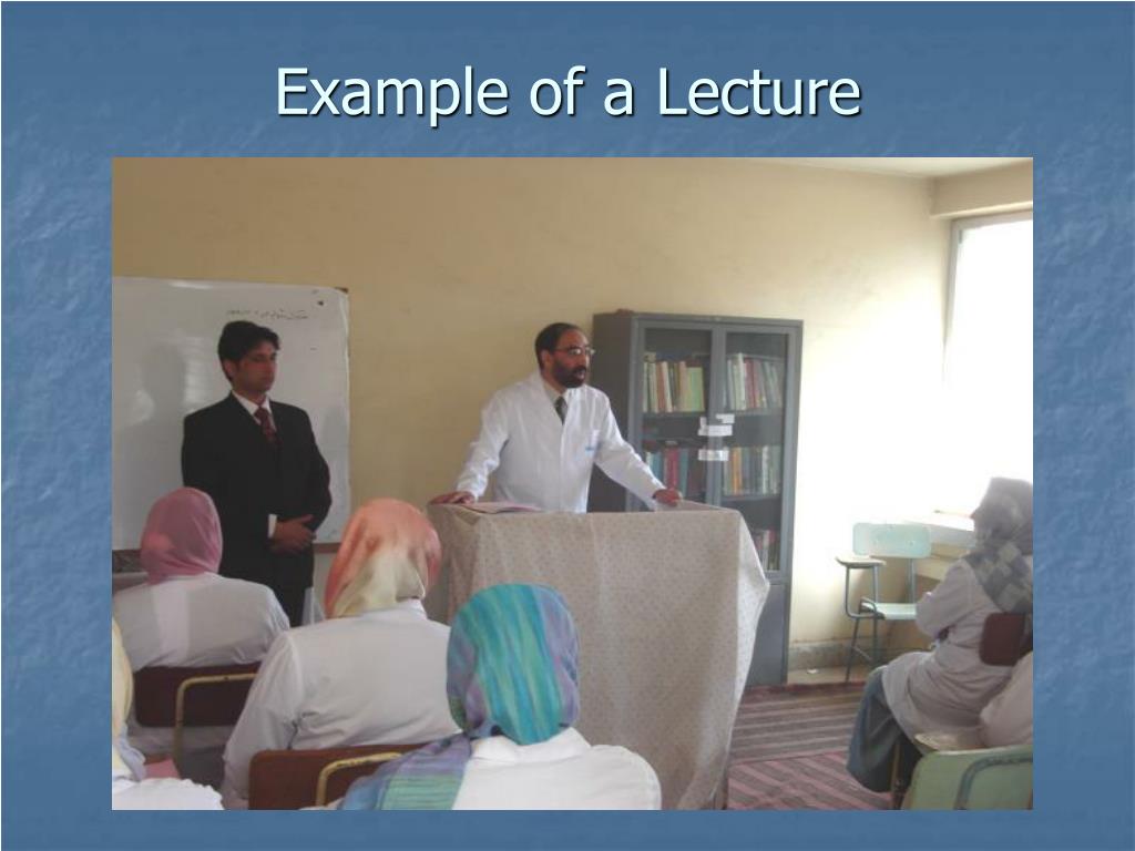Time: May 2007 Mid semester, 2 weeks Class 2nd students Random 20 students Distribution, collection and analysis: Dr Sharifi, Prof Anwar, Prof Ahmadzai Items in the questionnaire Punctuality Skill Knowledge General impression Scoring: Satisfactory, fair and not fair Percentage Methods