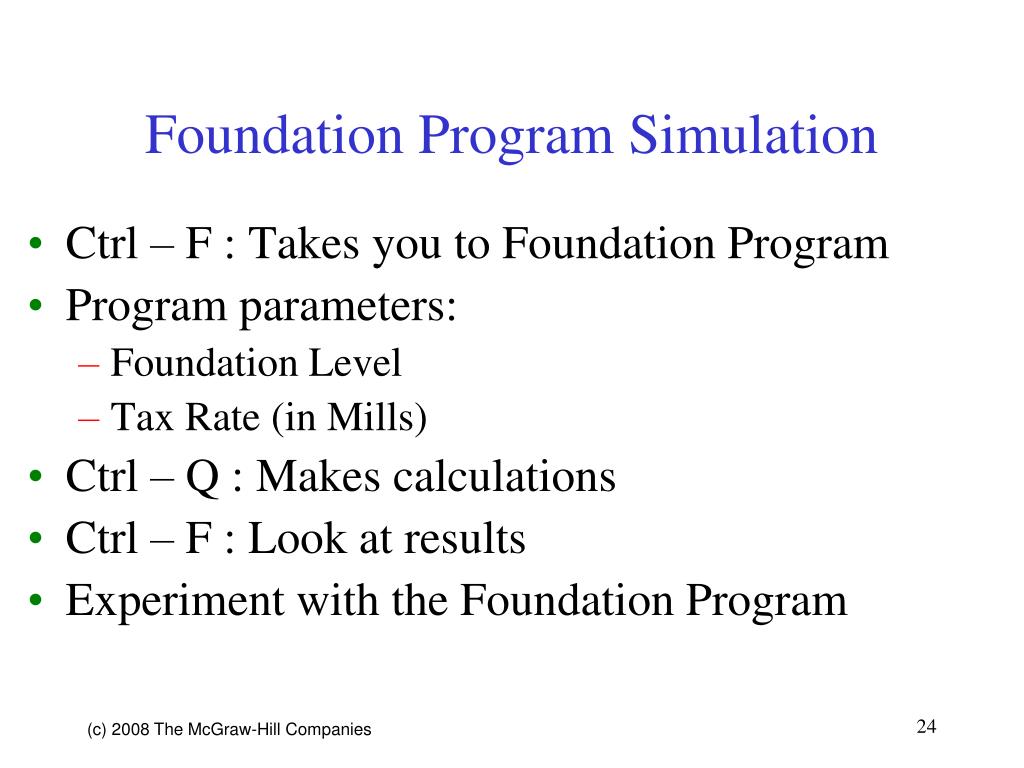 Foundation Program Simulation • Ctrl – F : Takes you to Foundation Program • Program parameters: • Foundation Level • Tax Rate (in Mills) • Ctrl – Q : Makes calculations • Ctrl – F : Look at results • Experiment with the Foundation Program