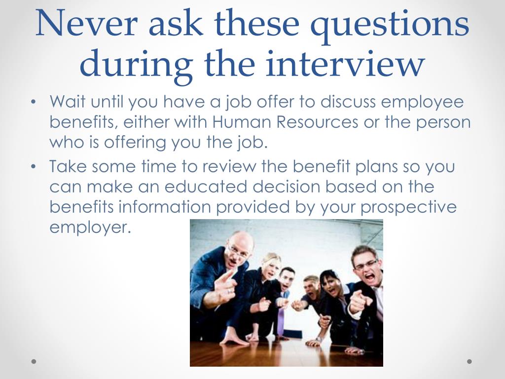Never ask these questions during the interview • Wait until you have a job offer to discuss employee benefits, either with Human Resources or the person who is offering you the job. • Take some time to review the benefit plans so you can make an educated decision based on the benefits information provided by your prospective employer.