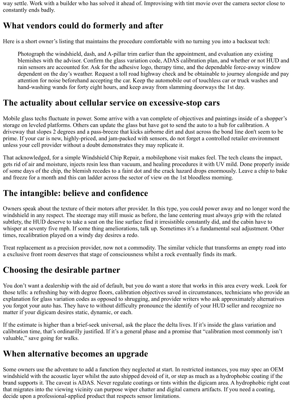 way settle. Work with a builder who has solved it ahead of. Improvising with tint movie over the camera sector close to constantly ends badly. What vendors could do formerly and after Here is a short owner’s listing that maintains the procedure comfortable with no turning you into a backseat tech: Photograph the windshield, dash, and A-pillar trim earlier than the appointment, and evaluation any existing blemishes with the advisor. Confirm the glass variation code, ADAS calibration plan, and whether or not HUD and rain sensors are accounted for. Ask for the adhesive logo, therapy time, and the dependable force-away window dependent on the day’s weather. Request a toll road highway check and be obtainable to journey alongside and pay attention for noise beforehand accepting the car. Keep the automobile out of touchless car or truck washes and hand-washing wands for forty eight hours, and keep away from slamming doorways the 1st day. The actuality about cellular service on excessive-stop cars Mobile glass techs fluctuate in power. Some arrive with a van complete of objectives and paintings inside of a shopper’s storage on leveled platforms. Others can update the glass but have got to send the auto to a hub for calibration. A driveway that slopes 2 degrees and a pass-breeze that kicks airborne dirt and dust across the bond line don't seem to be prime. If your car is new, highly-priced, and jam-packed with sensors, do not forget a controlled retailer environment unless your cell provider without a doubt demonstrates they may replicate it. That acknowledged, for a simple Windshield Chip Repair, a mobilephone visit makes feel. The tech cleans the impact, gets rid of air and moisture, injects resin less than vacuum, and healing procedures it with UV mild. Done properly inside of some days of the chip, the blemish recedes to a faint dot and the crack hazard drops enormously. Leave a chip to bake and freeze for a month and this can ladder across the sector of view on the 1st bloodless morning. The intangible: believe and confidence Owners speak about the texture of their motors after provider. In this type, you could power away and no longer word the windshield in any respect. The steerage may still music as before, the lane centering must always grip with the related subtlety, the HUD deserve to take a seat on the line surface find it irresistible constantly did, and the cabin have to whisper at seventy five mph. If some thing ameliorations, talk up. Sometimes it’s a fundamental seal adjustment. Other times, recalibration played on a windy day desires a redo. Treat replacement as a precision provider, now not a commodity. The similar vehicle that transforms an empty road into a exclusive front room deserves that stage of consciousness whilst a rock eventually finds its mark. Choosing the desirable partner You don’t want a dealership with the aid of default, but you do want a store that works in this area every week. Look for those tells: a refreshing bay with degree floors, calibration objectives saved in circumstances, technicians who provide an explanation for glass variation codes as opposed to shrugging, and provider writers who ask approximately alternatives you forgot your auto has. They have to without difficulty pronounce the identify of your HUD seller and recognize no matter if your digicam desires static, dynamic, or each. If the estimate is higher than a brief-seek universal, ask the place the delta lives. If it’s inside the glass variation and calibration time, that’s ordinarilly justified. If it’s a general phase and a promise that “calibration most commonly isn’t valuable,” save going for walks. When alternative becomes an upgrade Some owners use the adventure to add a function they neglected at start. In restricted instances, you may spec an OEM windshield with the acoustic layer whilst the auto shipped devoid of it, or step as much as a hydrophobic coating if the brand supports it. The caveat is ADAS. Never regulate coatings or tints within the digicam area. A hydrophobic right coat that migrates into the viewing vicinity can purpose wiper chatter and digital camera artifacts. If you need a coating, decide upon a professional-applied product that respects sensor limitations.