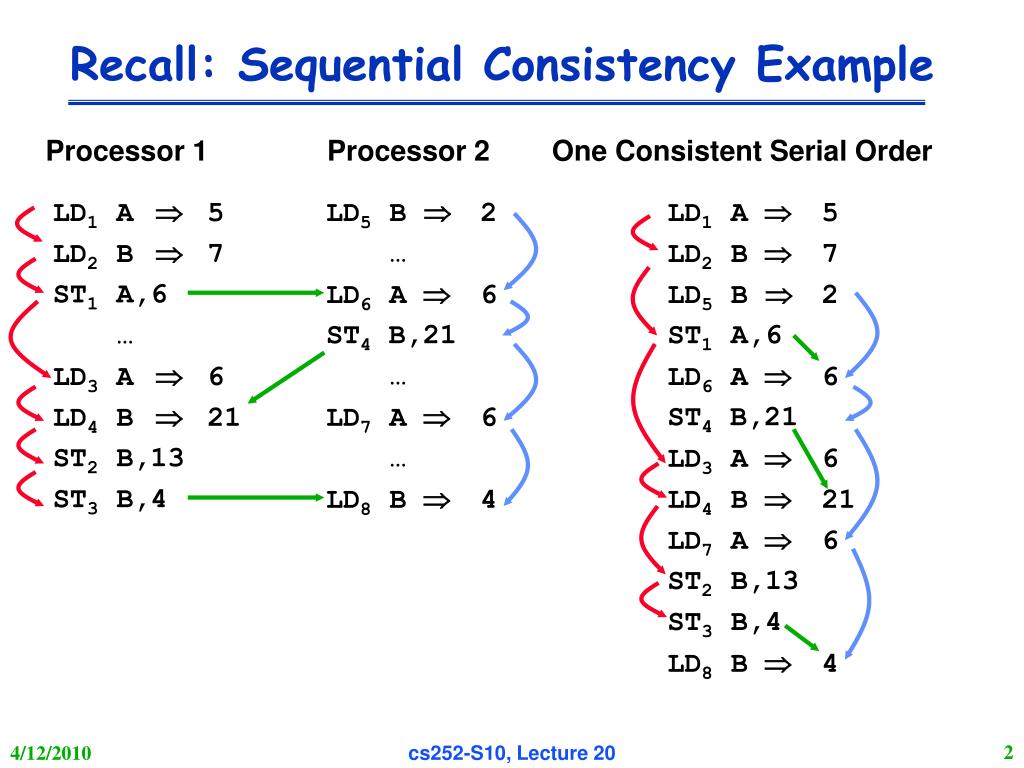 Recall: Sequential Consistency Example Processor 1 Processor 2 One Consistent Serial Order LD1 A 5 LD2 B 7 ST1 A,6 … LD3 A 6 LD4 B 21 ST2 B,13 ST3 B,4 LD5 B 2 … LD6 A 6 ST4 B,21 … LD7 A 6 … LD8 B 4 LD1 A 5 LD2 B 7 LD5 B 2 ST1 A,6 LD6 A 6 ST4 B,21 LD3 A 6 LD4 B 21 LD7 A 6 ST2 B,13 ST3 B,4 LD8 B 4 cs252-S10, Lecture 20