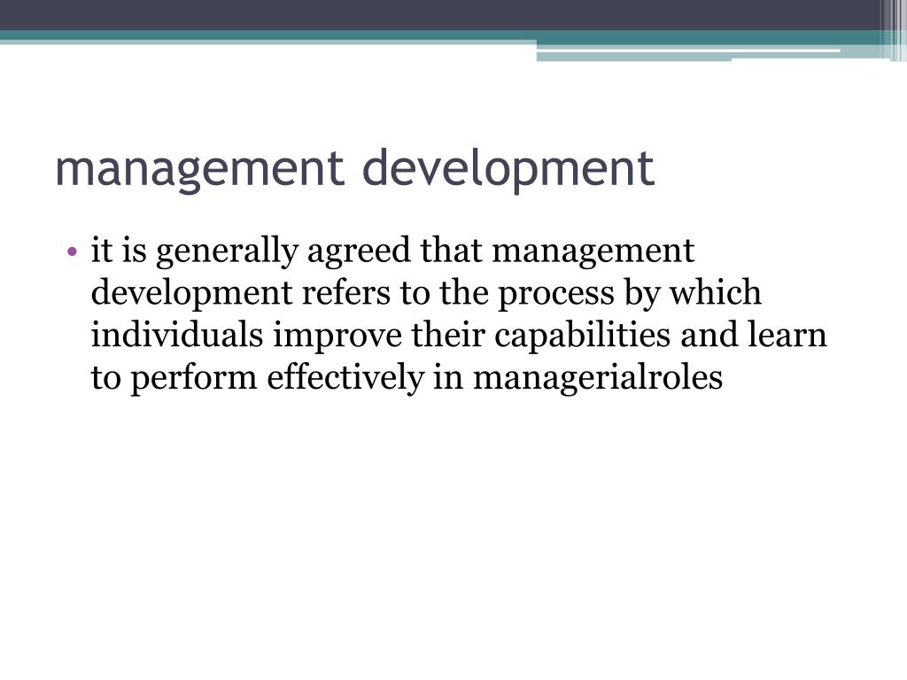 management development • it is generally agreed that management development refers to the process by which individuals improve their capabilities and learn to perform effectively in managerialroles