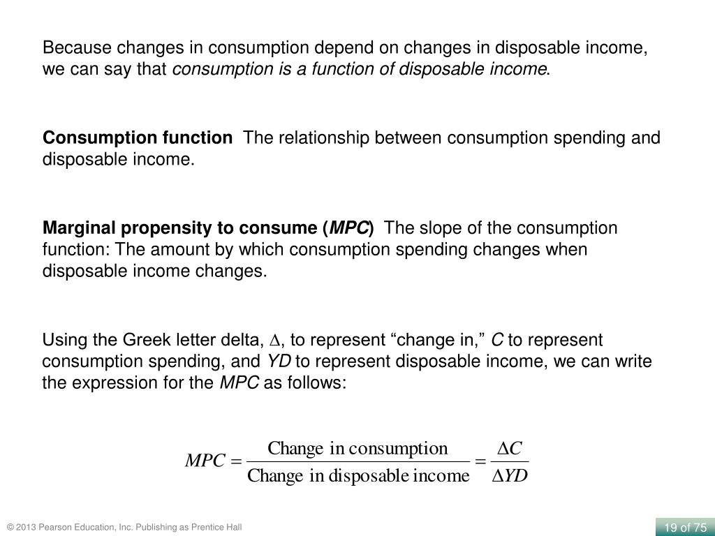 Because changes in consumption depend on changes in disposable income, we can say that consumption is a function of disposable income. Consumption function The relationship between consumption spending and disposable income. Marginal propensity to consume (MPC) The slope of the consumption function: The amount by which consumption spending changes when disposable income changes. Using the Greek letter delta, ∆, to represent “change in,” C to represent consumption spending, and YD to represent disposable income, we can write the expression for the MPC as follows: