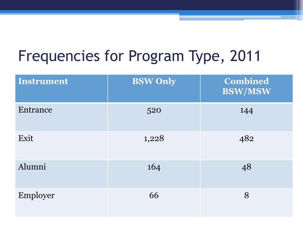 Expansion beyond BSW • Based upon CSWE assertions related to educational levels in social work education, we expanded testing to three additional groups: • MSW foundation students: • entering • exiting • Advanced standing students: • entering