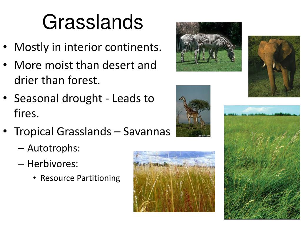 Grasslands • Mostly in interior continents. • More moist than desert and drier than forest. • Seasonal drought - Leads to fires. • Tropical Grasslands – Savannas • Autotrophs: • Herbivores: • Resource Partitioning