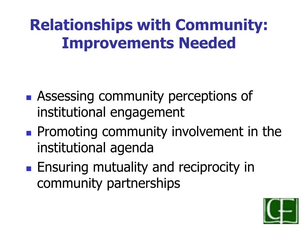 Relationships with Community: Improvements Needed • Assessing community perceptions of institutional engagement • Promoting community involvement in the institutional agenda • Ensuring mutuality and reciprocity in community partnerships