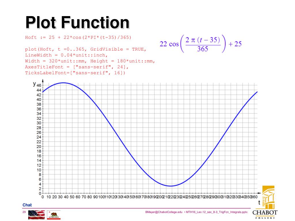 Plot Function Hoft := 25 + 22*cos(2*PI*(t-35)/365) plot(Hoft, t =0..365, GridVisible = TRUE,LineWidth = 0.04*unit::inch, Width = 320*unit::mm, Height = 180*unit::mm,AxesTitleFont = ["sans-serif", 24],TicksLabelFont=["sans-serif", 16])