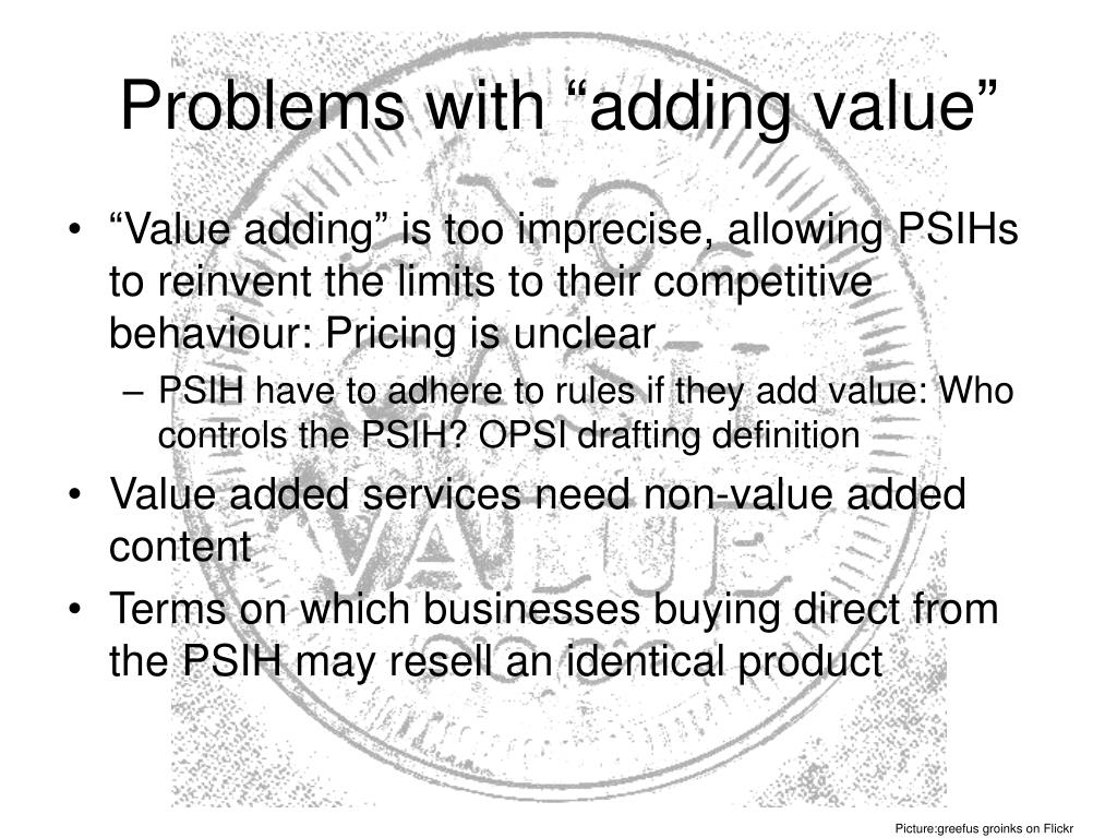 Problems with “adding value” • “Value adding” is too imprecise, allowing PSIHs to reinvent the limits to their competitive behaviour: Pricing is unclear • PSIH have to adhere to rules if they add value: Who controls the PSIH? OPSI drafting definition • Value added services need non-value added content • Terms on which businesses buying direct from the PSIH may resell an identical product Picture:greefus groinks on Flickr