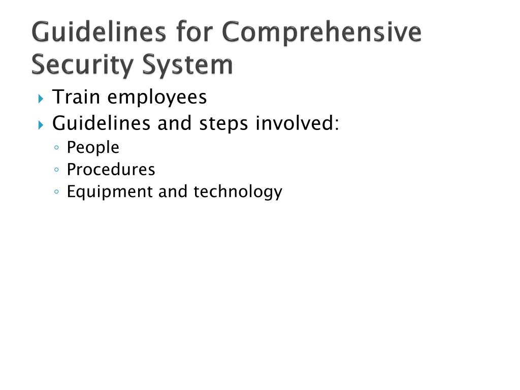 Guidelines for Comprehensive Security System • Train employees • Guidelines and steps involved: • People • Procedures • Equipment and technology