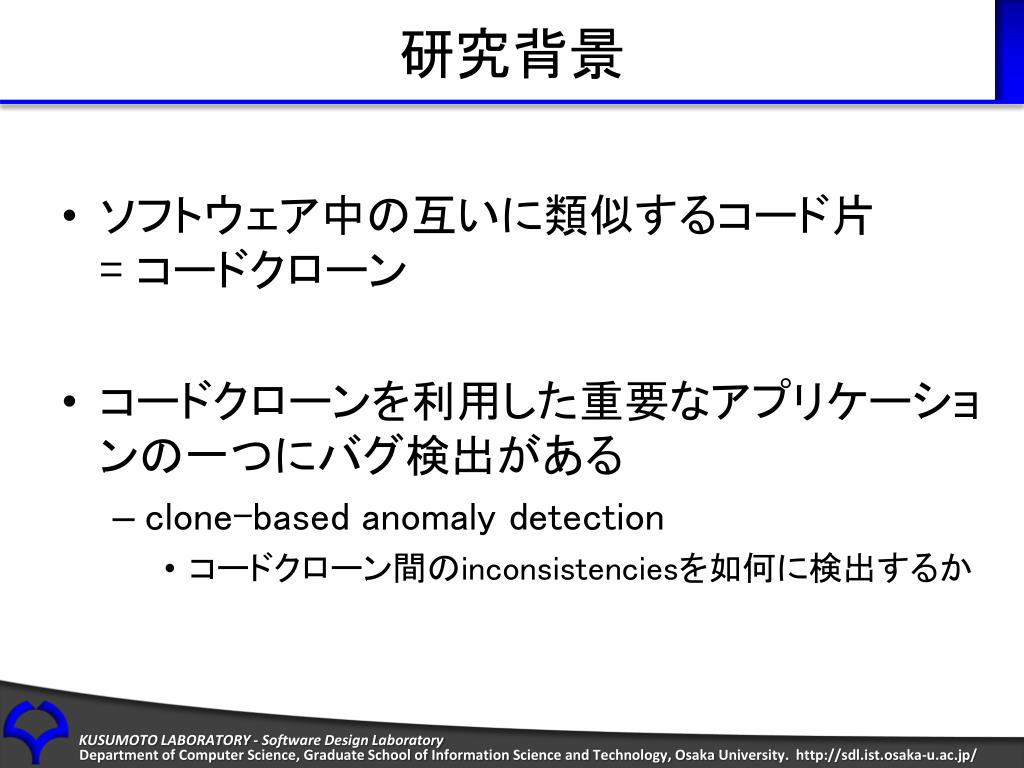 研究背景 • ソフトウェア中の互いに類似するコード片= コードクローン • コードクローンを利用した重要なアプリケーションの一つにバグ検出がある • clone-based anomaly detection • コードクローン間のinconsistenciesを如何に検出するか