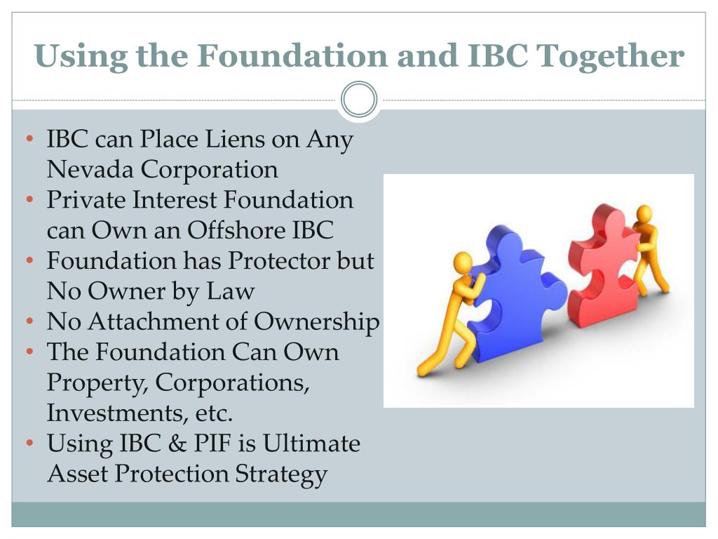 Using the Foundation and IBC Together • IBC can Place Liens on Any Nevada Corporation • Private Interest Foundation can Own an Offshore IBC • Foundation has Protector but No Owner by Law • No Attachment of Ownership • The Foundation Can Own Property, Corporations, Investments, etc. • Using IBC & PIF is Ultimate Asset Protection Strategy