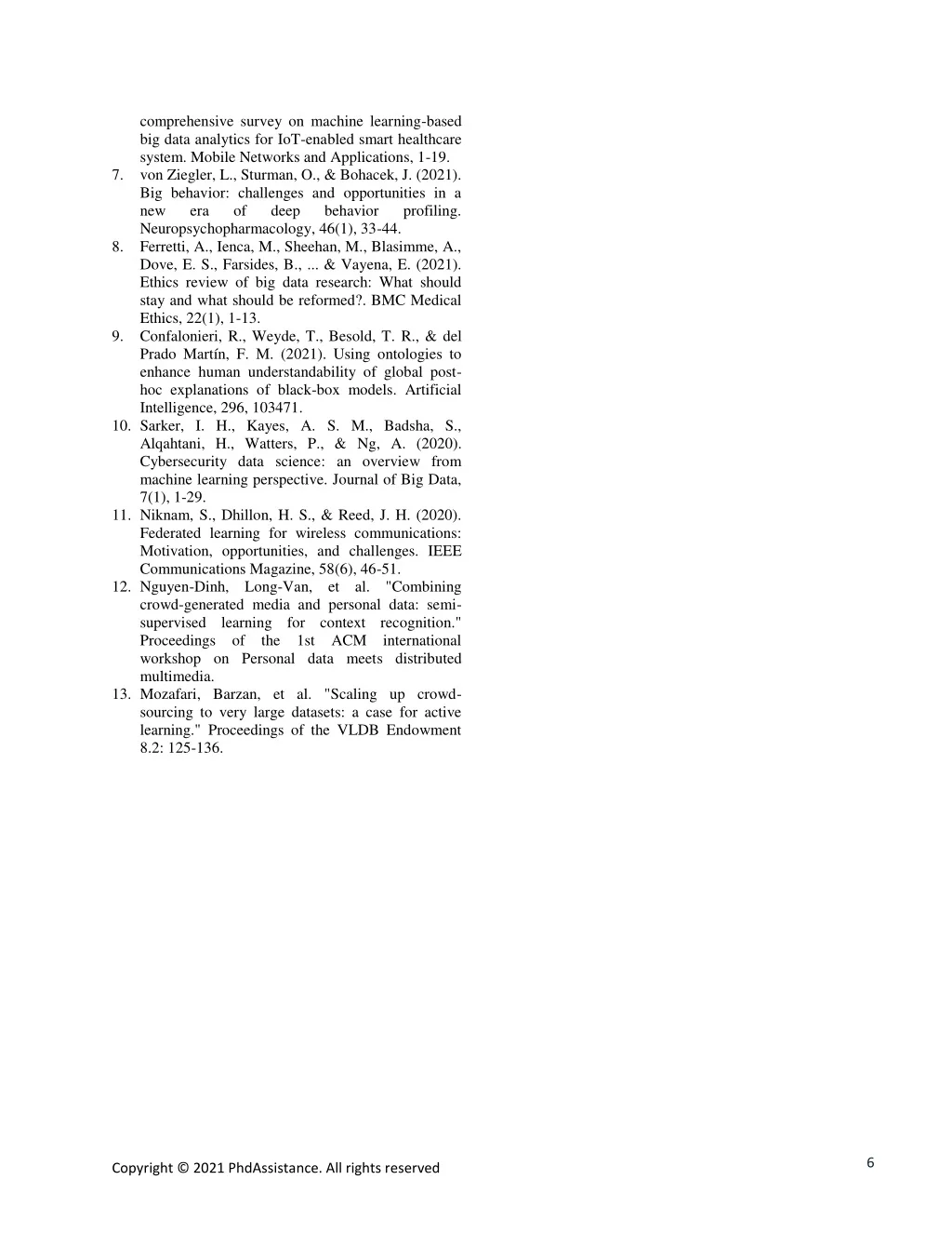 comprehensive survey on machine learning-based big data analytics for IoT-enabled smart healthcare system. Mobile Networks and Applications, 1-19. 7.von Ziegler, L., Sturman, O., & Bohacek, J. (2021). Big behavior: challenges and opportunities in a new era of deep Neuropsychopharmacology, 46(1), 33-44. 8.Ferretti, A., Ienca, M., Sheehan, M., Blasimme, A., Dove, E. S., Farsides, B., ... & Vayena, E. (2021). Ethics review of big data research: What should stay and what should be reformed?. BMC Medical Ethics, 22(1), 1-13. 9.Confalonieri, R., Weyde, T., Besold, T. R., & del Prado Martín, F. M. (2021). Using ontologies to enhance human understandability of global post- hoc explanations of black-box models. Artificial Intelligence, 296, 103471. 10.Sarker, I. H., Kayes, A. S. M., Badsha, S., Alqahtani, H., Watters, P., & Ng, A. (2020). Cybersecurity data science: an overview from machine learning perspective. Journal of Big Data, 7(1), 1-29. 11.Niknam, S., Dhillon, H. S., & Reed, J. H. (2020). Federated learning for wireless communications: Motivation, opportunities, and challenges. IEEE Communications Magazine, 58(6), 46-51. 12.Nguyen-Dinh, Long-Van, et al. "Combining crowd-generated media and personal data: semi- supervised learning for context recognition." Proceedings of the 1st ACM international workshop on Personal data meets distributed multimedia. 13.Mozafari, Barzan, et al. "Scaling up crowd- sourcing to very large datasets: a case for active learning." Proceedings of the VLDB Endowment 8.2: 125-136. behavior profiling. 6 Copyright © 2021 PhdAssistance. All rights reserved