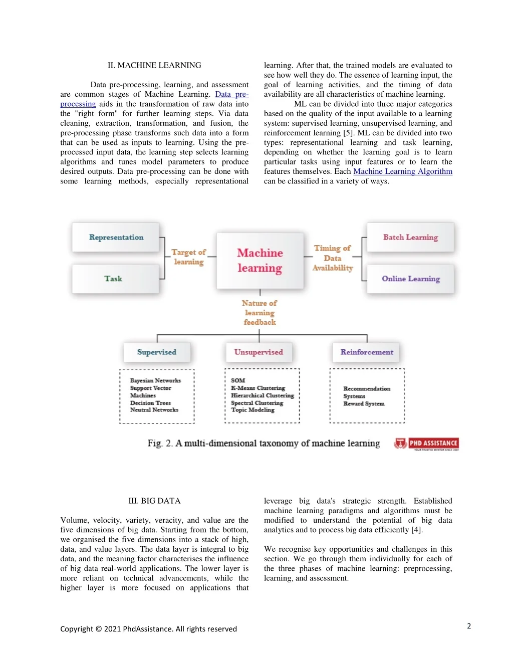 II. MACHINE LEARNING Data pre-processing, learning, and assessment are common stages of Machine Learning. Data pre- processing aids in the transformation of raw data into the "right form" for further learning steps. Via data cleaning, extraction, transformation, and fusion, the pre-processing phase transforms such data into a form that can be used as inputs to learning. Using the pre- processed input data, the learning step selects learning algorithms and tunes model parameters to produce desired outputs. Data pre-processing can be done with some learning methods, especially representational learning. After that, the trained models are evaluated to see how well they do. The essence of learning input, the goal of learning activities, and the timing of data availability are all characteristics of machine learning. ML can be divided into three major categories based on the quality of the input available to a learning system: supervised learning, unsupervised learning, and reinforcement learning [5]. ML can be divided into two types: representational learning and task learning, depending on whether the learning goal is to learn particular tasks using input features or to learn the features themselves. Each Machine Learning Algorithm can be classified in a variety of ways. III. BIG DATA leverage big data's strategic strength. Established machine learning paradigms and algorithms must be modified to understand the potential of big data analytics and to process big data efficiently [4]. We recognise key opportunities and challenges in this section. We go through them individually for each of the three phases of machine learning: preprocessing, learning, and assessment. Volume, velocity, variety, veracity, and value are the five dimensions of big data. Starting from the bottom, we organised the five dimensions into a stack of high, data, and value layers. The data layer is integral to big data, and the meaning factor characterises the influence of big data real-world applications. The lower layer is more reliant on technical advancements, while the higher layer is more focused on applications that 2 Copyright © 2021 PhdAssistance. All rights reserved