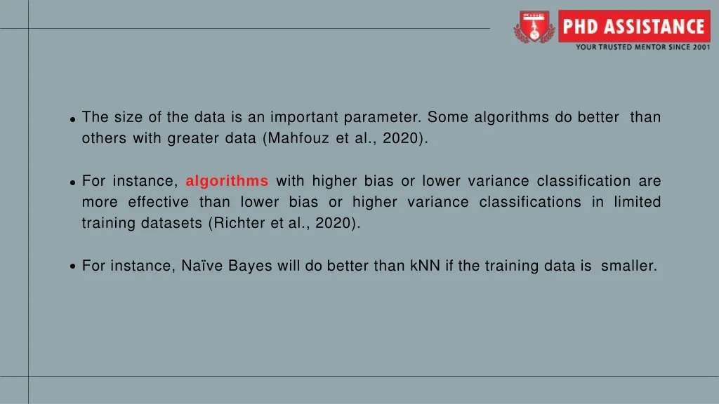 The size of the data is an important parameter. Some algorithms do better thanotherswithgreaterdata(Mahfouzetal.,2020). For instance, algorithms with higher bias or lower variance classification are more effective than lower bias or higher variance classifications in limited training datasets (Richter et al.,2020). For instance, Naïve Bayes will do better than kNN if the training data is smaller.