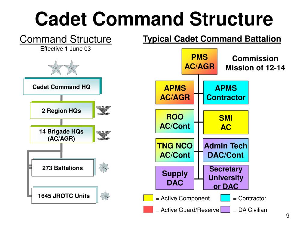 = Contractor = Active Component = Active Guard/Reserve = DA Civilian Cadet Command Structure Command Structure Effective 1 June 03 Typical Cadet Command Battalion PMS AC/AGR Commission Mission of 12-14 APMS AC/AGR APMS Contractor ROO AC/Cont SMI AC TNG NCO AC/Cont Admin Tech DAC/Cont Secretary University or DAC Supply DAC
