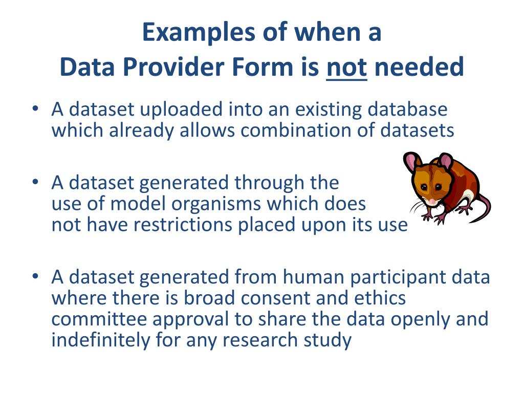 Examples of when a Data Provider Form is not needed • A dataset uploaded into an existing database which already allows combination of datasets • A dataset generated through the use of model organisms which does not have restrictions placed upon its use • A dataset generated from human participant data where there is broad consent and ethics committee approval to share the data openly and indefinitely for any research study